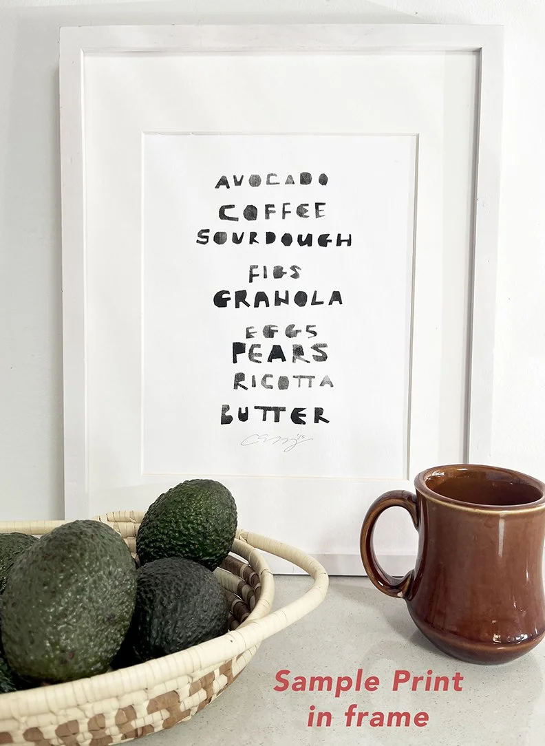 The ordinary, elevated. This hand-lettered, hand-cut, hand-printed one-of-a-kind art piece of your grocery list is sized to fit an 8×10 opening. It is printed with archival ink on high-quality art paper. Each print is unique and signed by the artist. Perfect for hanging in your kitchen or gifting to a foodie friend.